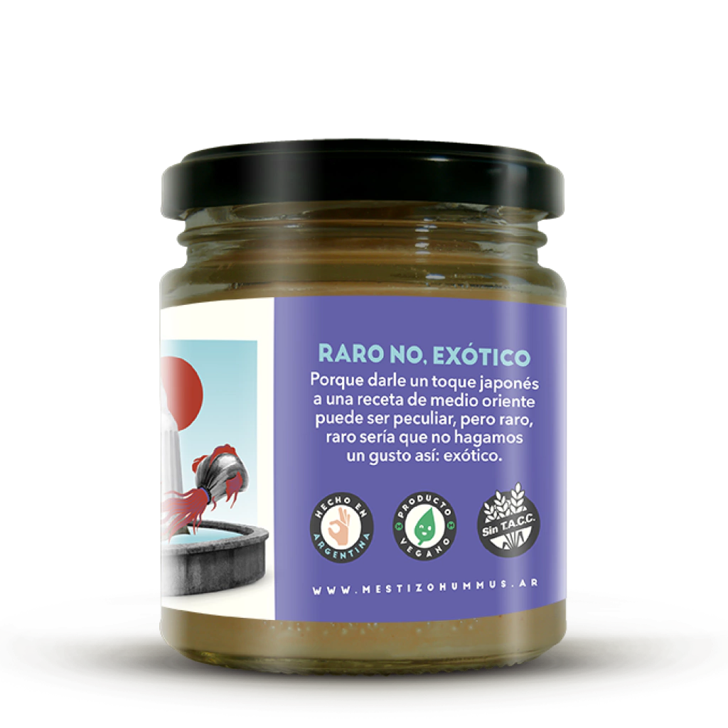Un hummus definitivamente etzótico. Como la palabra exótico, que por cierto, le queda mucho mejor que raro. Porque darle un toque japo a una receta de medio oriente puede ser peculiar, pero raro, raro sería que no hagamos un gusto así: etzótico.